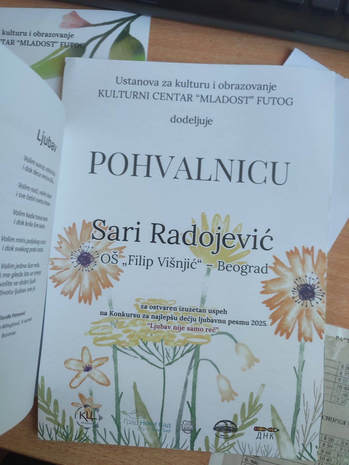 На Конкурсу за најлепшу дечју љубавну песму 2025, САРИ РАДОЈЕВИЋ је додељена похвалница, a ментору Миланки Берковић захвалница.